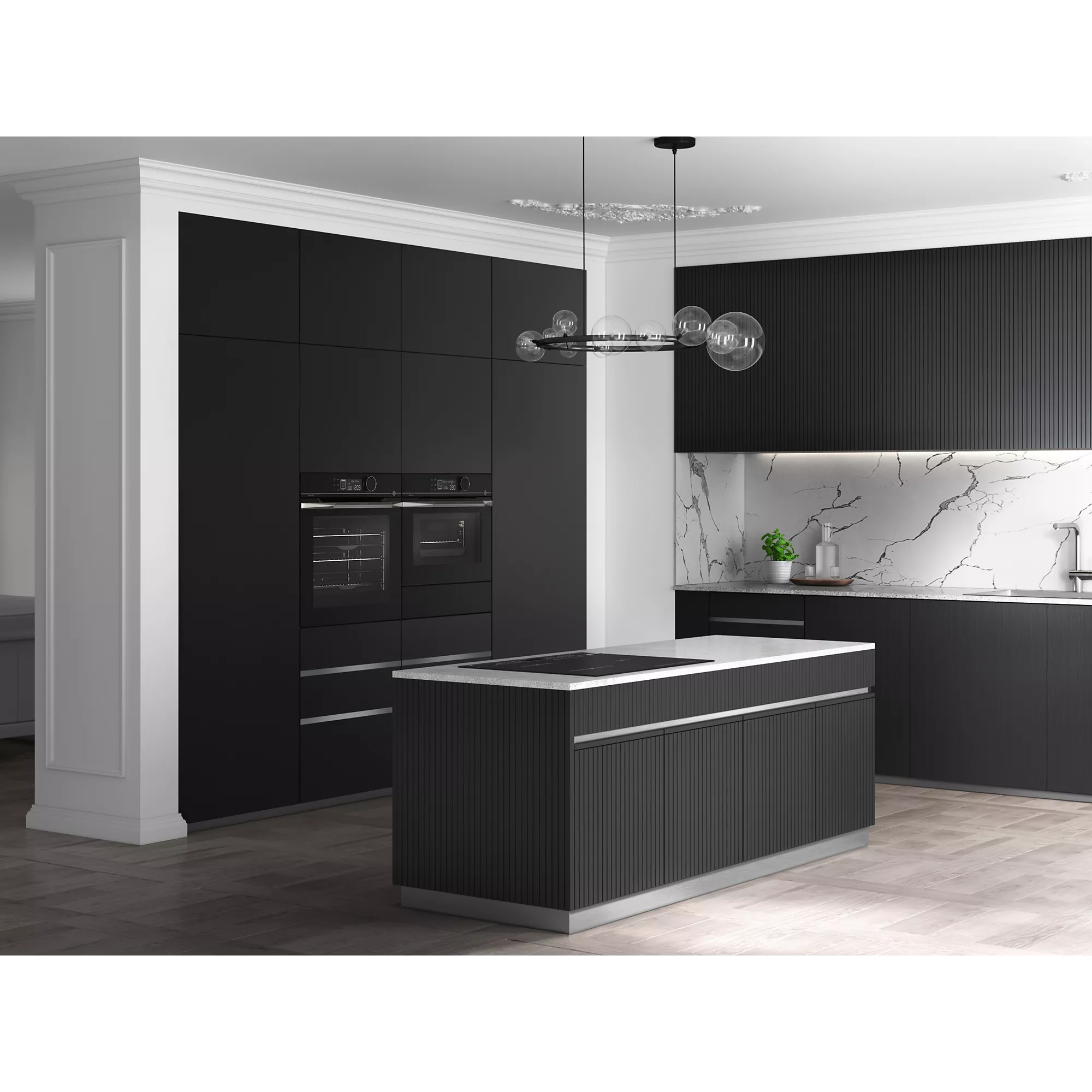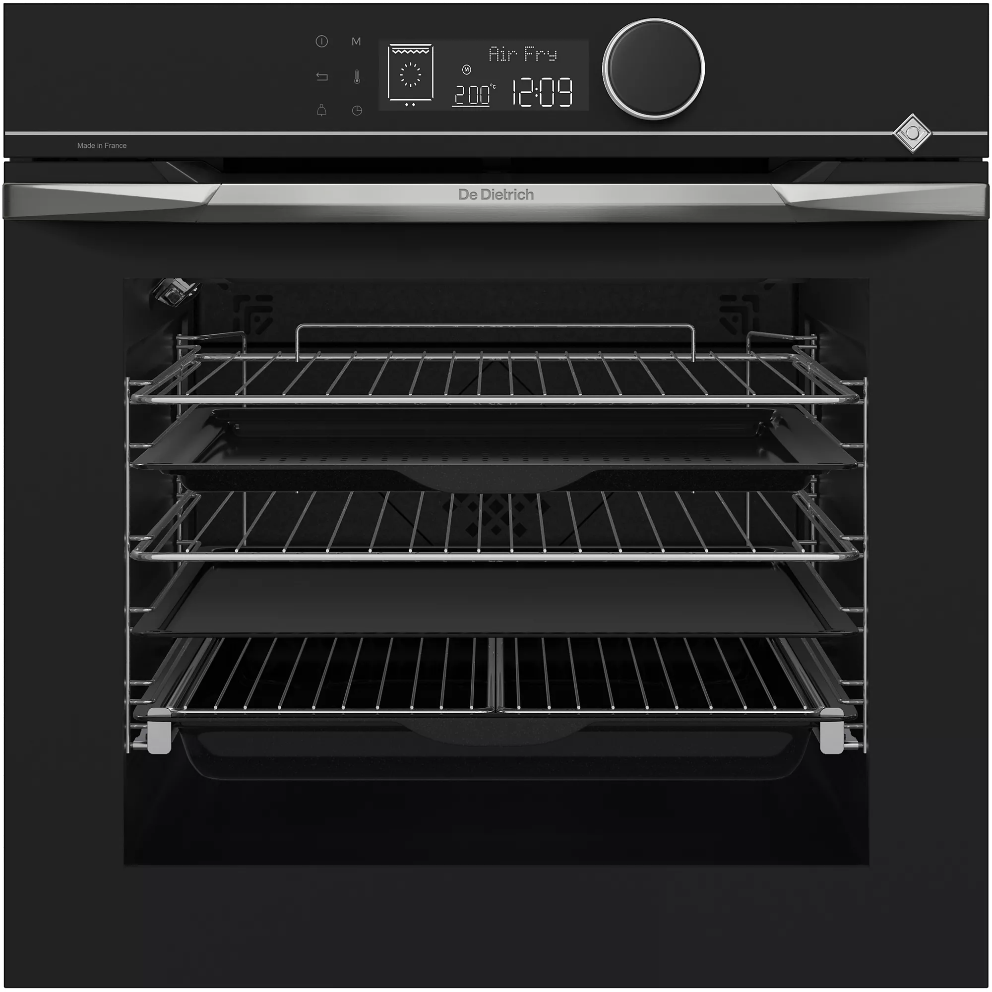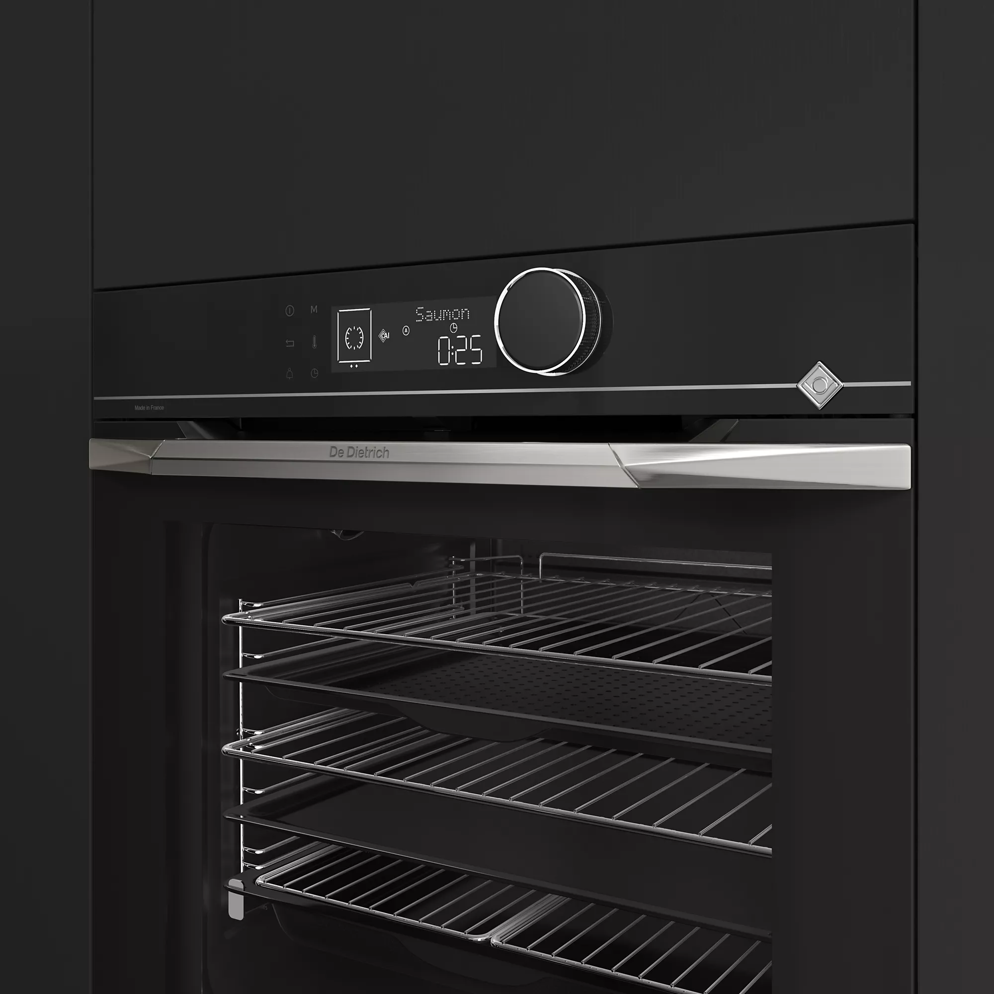 - Design premium De Dietrich : finition inox/verre noir, look vraiment haut de gamme dans une cuisine équipée.